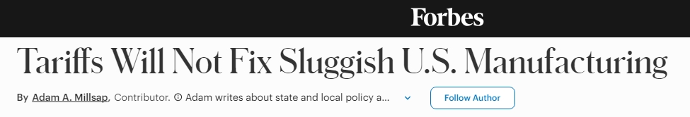 中国日报10月15日电 美国《福布斯》杂志网站近日发表文章称,特朗普政府正试图通过关税促进美国制造业增长。它最近把目标瞄准了家具行业,并威胁要对“任何不在美国生产家具的国家”征收额外关税。然而,这个计划不太可能有效。文章指出,自2007年美国陷入“大衰退”以来,美国制造业处境艰难,关税并不能很好地解决长期伤痛。保守派智库美国企业研究所发布的一项新研究显示,通过制造业回流扭转长期失业趋势的成本极其高昂。 《福布斯》杂志网站上的一篇文章的屏幕截图。根据研究估计,如果使用关税作为彻底消除制造业贸易逆差的手段,美国制造业产品的消费者每年将要承担6050亿美元的成本,其中包括关税带来的进口成本增加和当地生产成本增加。此外,尽管关税带动的内需可创造约270万个制造业就业岗位,但如果将6050亿美元的额外成本分摊到新增就业岗位上,则相当于每个就业岗位每年的成本高达22.5万美元,而且这一成本将持续到关税降低或取消为止。该研究强调,这只是一个保守的估计。如果关税成本主要由美国消费者承担,那么每份工作的年成本可能会升至 55 万美元。文章称,特朗普政府任期内消除制造业贸易逆差并不是一个现实的目标。建造新工厂、雇用和培训新员工需要数年时间并建立生产线,企业只有在确定关税长期保持稳定的情况下才会进行这些投资。然而,当前的政策前景非常模糊,这种不确定性正在影响劳动力。数据显示,美国供应管理协会9月制造业采购经理人指数(ISM PMI)连续第7个月低于50%荣枯线,表明制造业处于衰退状态。调查受访者普遍表示关税会影响企业运营。此外,制造业投资近三季度也有所下降。即使美国公司希望增加产量以应对关税,前方还存在另一个障碍。文章指出,自2000年代末以来,美国劳动生产率增长持续疲弱。 1987年至2007年,劳动生产率年均增长3.4%;从2010年至2022年,年均负增长为-0.5%。文章认为,关税可以在一定程度上减少对进口商品的需求,增加对本土产品的需求,但不会提高美国制造商低成本、快速生产产品的能力。美国在利用机器人提高制造业生产率方面也落后于许多国家。未来的制造业永远不会依赖大量的人力重复流水线作业。美国如果想主导关键产业,就必须把重点放在自动化上。文章称,关税不仅有助于提振美国制造业,反而会对其造成损害。关税推高了钢铁等关键原材料和零部件的成本,而政策的实施却难以预测。不可预测性也使得公司很难制定长期计划。其他措施特朗普政府正在尝试的措施可能会有所帮助,但不足以抵消关税的负面影响。文章强调,必须拿出切实证据来证明关税实际上对美国制造业有利,而目前的证据却指向相反的结论。关税以价格上涨和选择减少的形式将巨大成本转嫁给了美国消费者和企业。如果特朗普政府认真支持美国制造商,就应该把重点放在提高生产率的改革上,而不是仅仅依赖关税。 。
