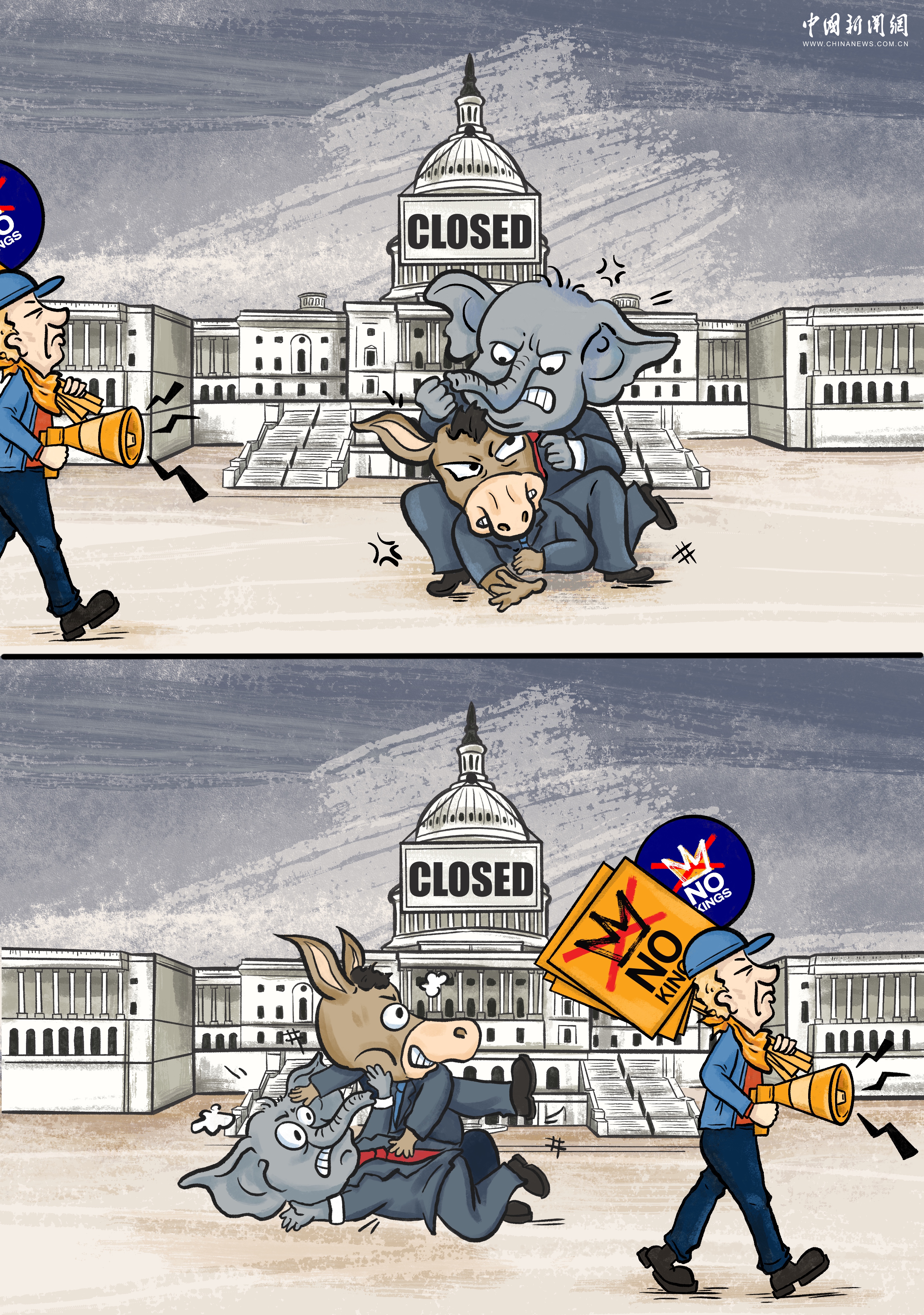 连日来,从纽约到洛杉矶,抗议活动已走上美国2700多个城镇的街头。数百万人举着“禁止国王”的标语,反对特朗普政府采取的严厉移民政策、强制部署国民警卫队、提高关税等行政措施。这次全国性的示威活动是6月14日全国首次“无王”抗议活动的延续。在政治中心华盛顿,现实就像一幅“漫画”,不断展现出讽刺的场面:一边是席卷美国的舆论浪潮,一边是白宫门前无休无止的党派之争。所有这些都表明,幻想与现实、美国的政治原则与实践之间存在着巨大的脱节。当举着“无王”标语的人们不经意间传过时,打斗中的驴子和大象似乎短暂地停止了,他们震惊地意识到真正的问题不再是他们之间的胜负——而是联邦政府的大门挂着“关闭”的牌子,对沸腾的舆论关闭了。